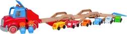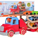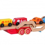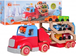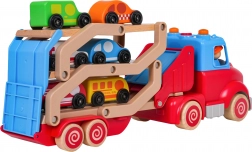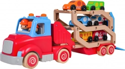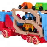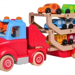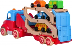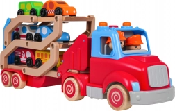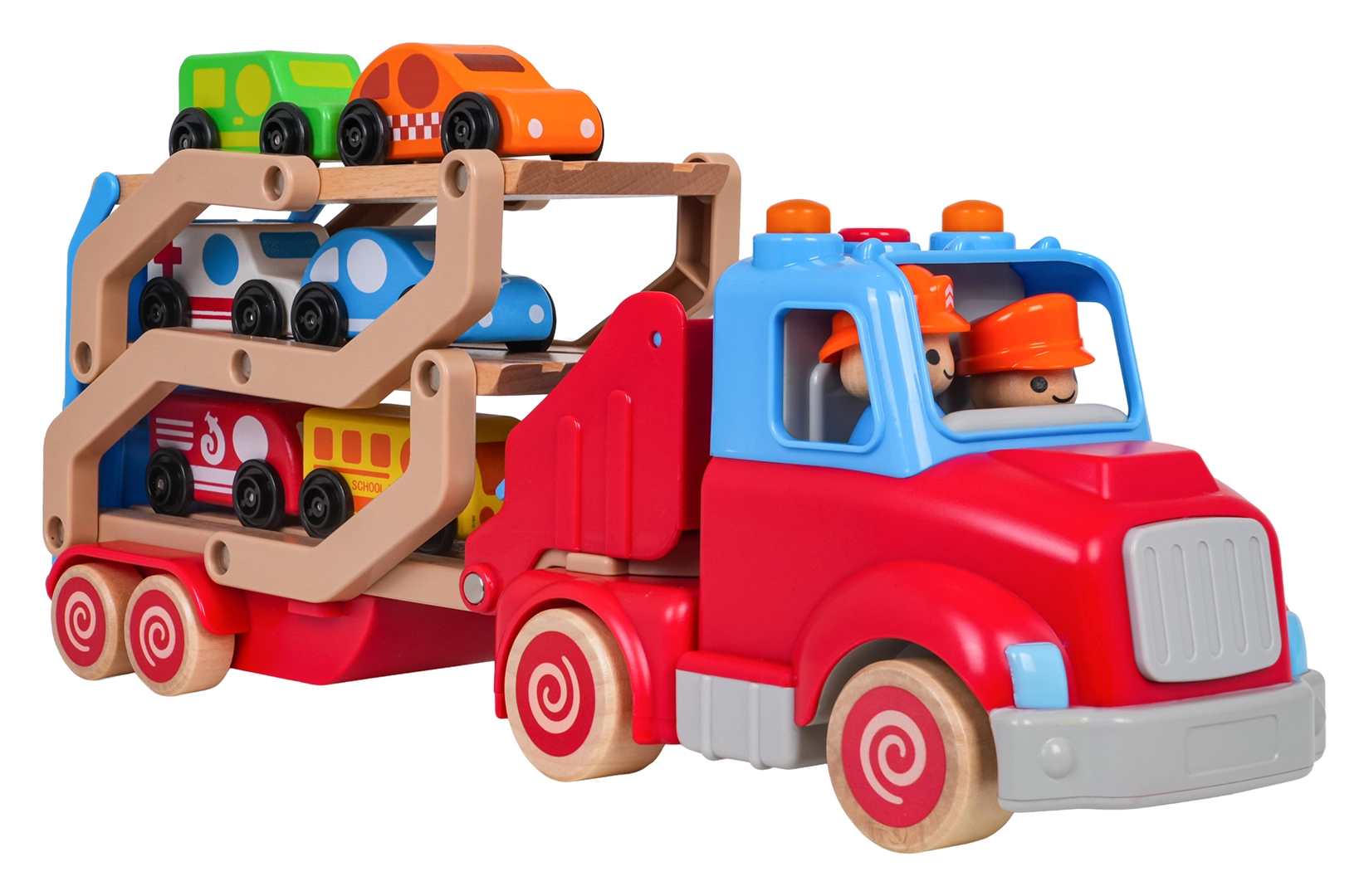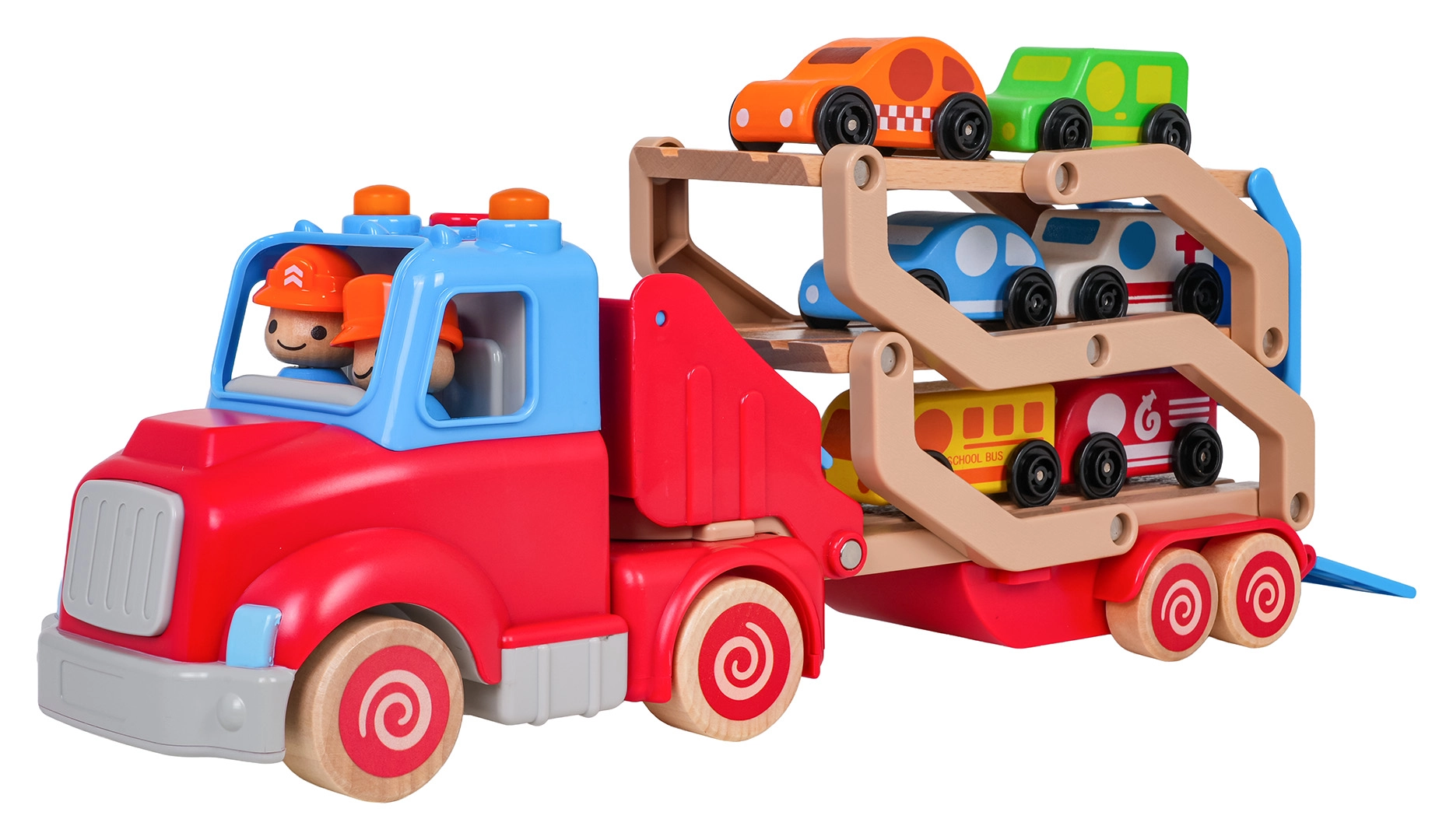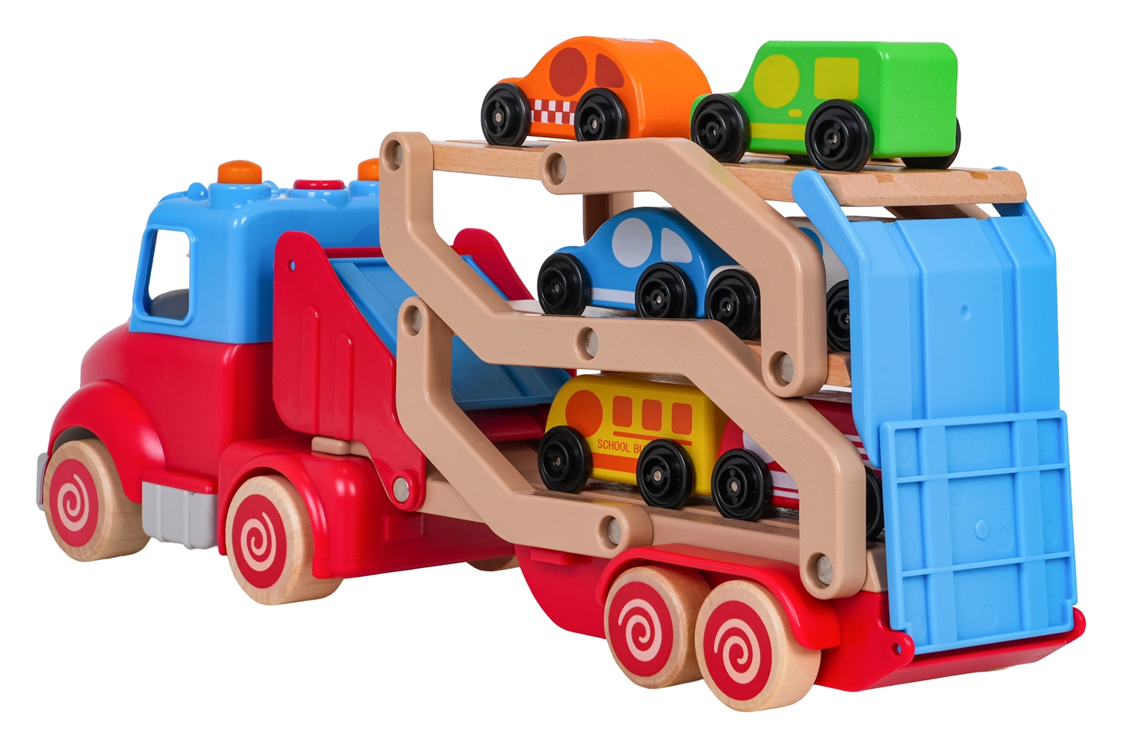Acest camion din lemn cu rampă de tractare sprijină motricitatea fină, coordonarea și imaginația. Datorită culorilor vii și elementelor funcționale – rampă ce se ridică și se rabatează, ansamblu detașabil, roți mobile – copiii pot încărca și descărca ușor mașinuțele și își pot crea propriile povești din trafic.