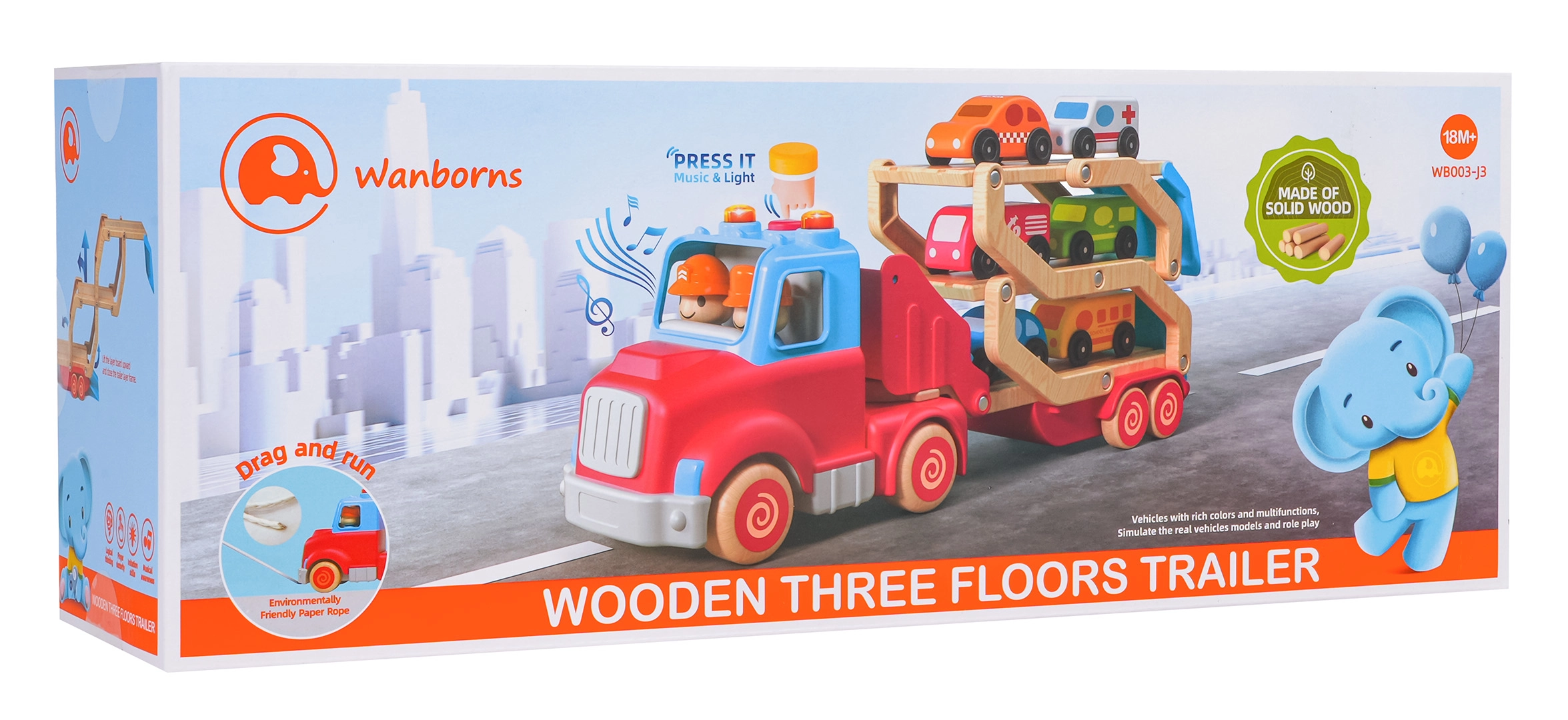Pe acoperișul cabinei se află un buton pentru sunete realiste de pornire, claxon și melodii, însoțite de luminițe clipitoare. Setul include 6 vehicule din lemn (poliție, taxi, mașină de pompieri, ambulanță, autobuz, dubă) și 2 personaje. Ochetul frontal pentru atașarea unei sfori permite tractarea ansamblului.