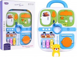 Geanta este realizată din materiale plastice sigure și rezistente, în culori vii, iar datorită mânerului integrat copiii o pot transporta ușor. Include și mini xilofon (cimbal) cu baghetă, care dezvoltă ritmul și percepția auditivă. O soluție grozavă pentru joacă acasă sau în călătorii.