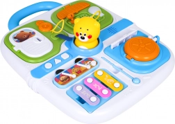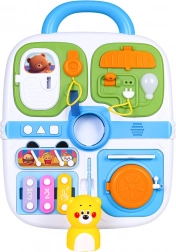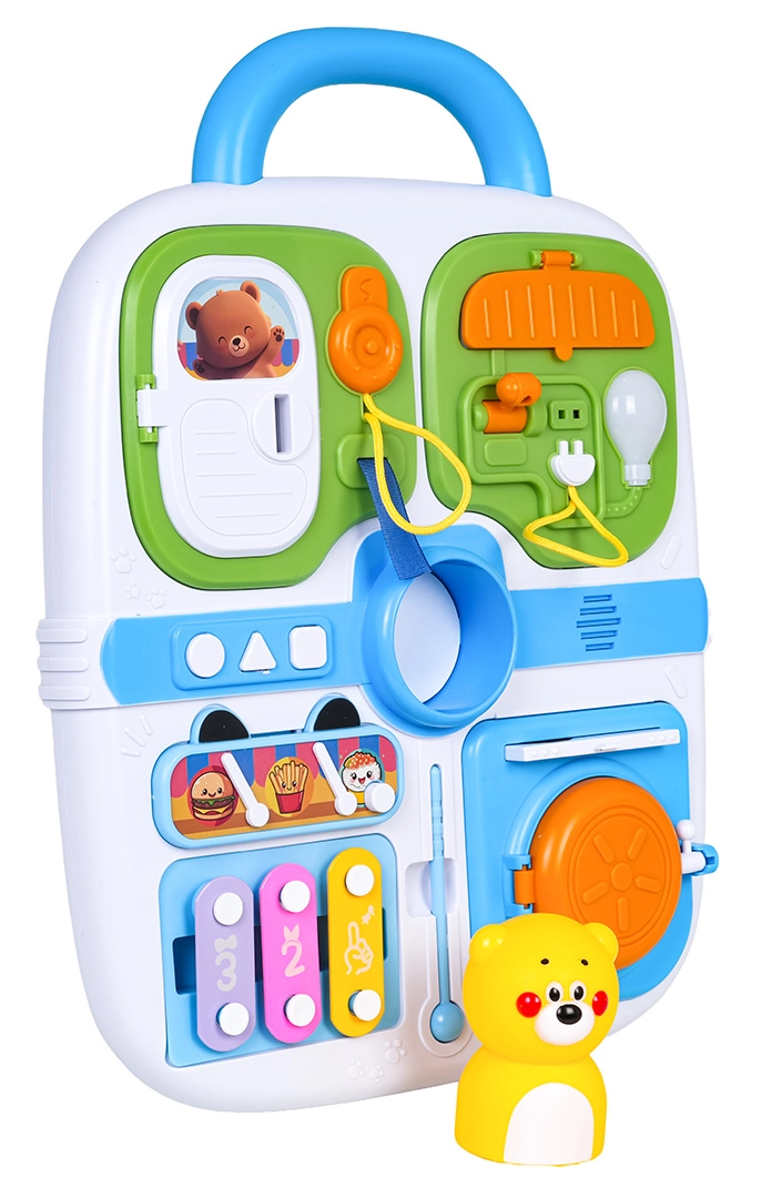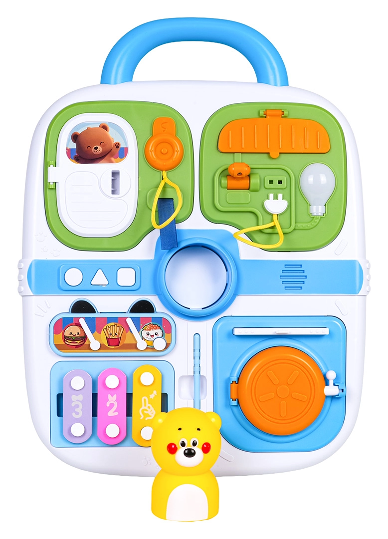 Această geantă de manipulare albastră este o alegere ideală pentru micii exploratori. Oferă o gamă variată de activități care stimulează curiozitatea copilului – de la ușițe cu cheiță, elemente extensibile și controlere rotative, până la efectul luminos al becului după conectarea cablului. Ursulețul central piuie la apăsare, iar trei butoane (cerc, triunghi, pătrat) redau melodii și sunete amuzante.