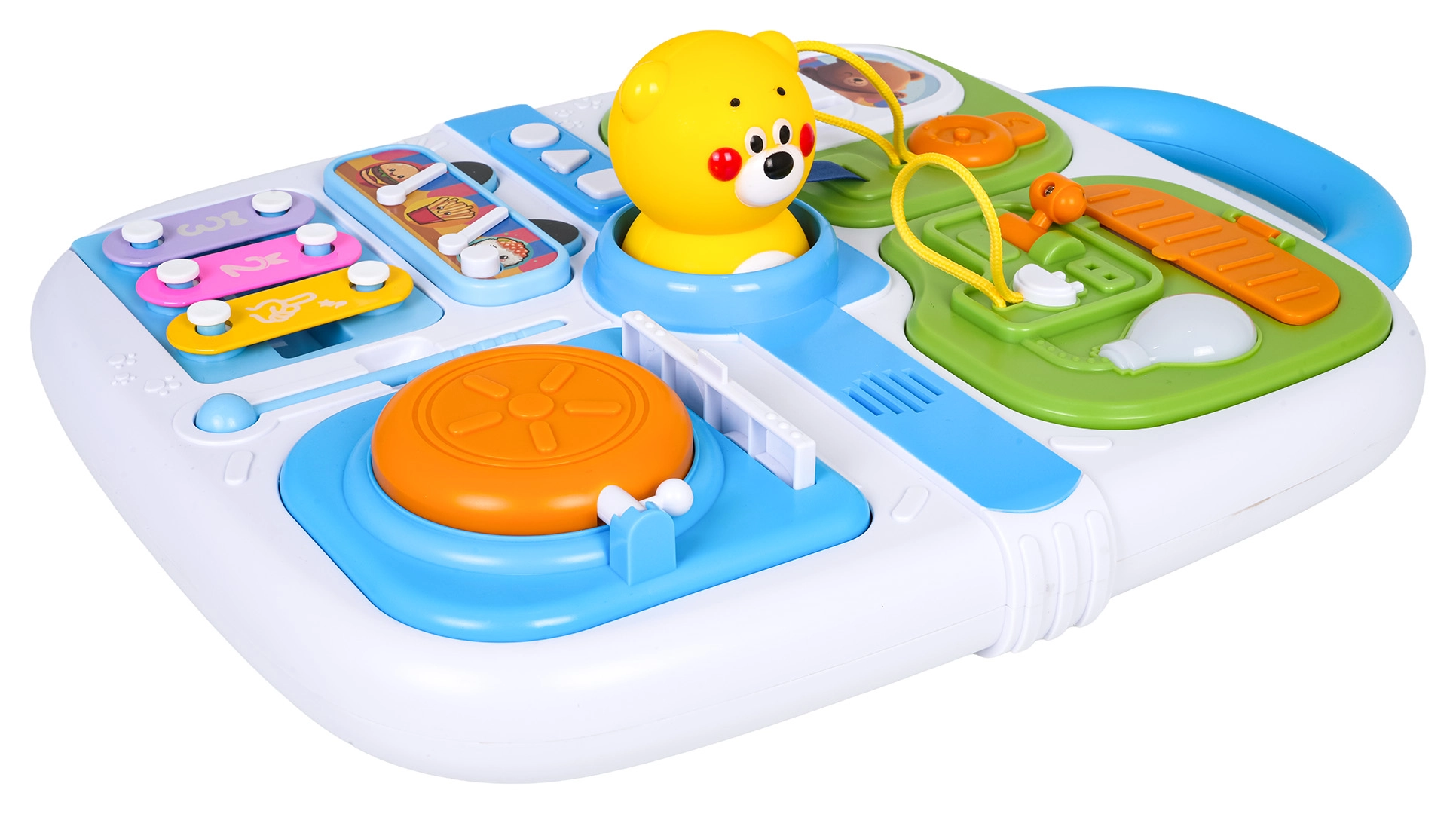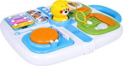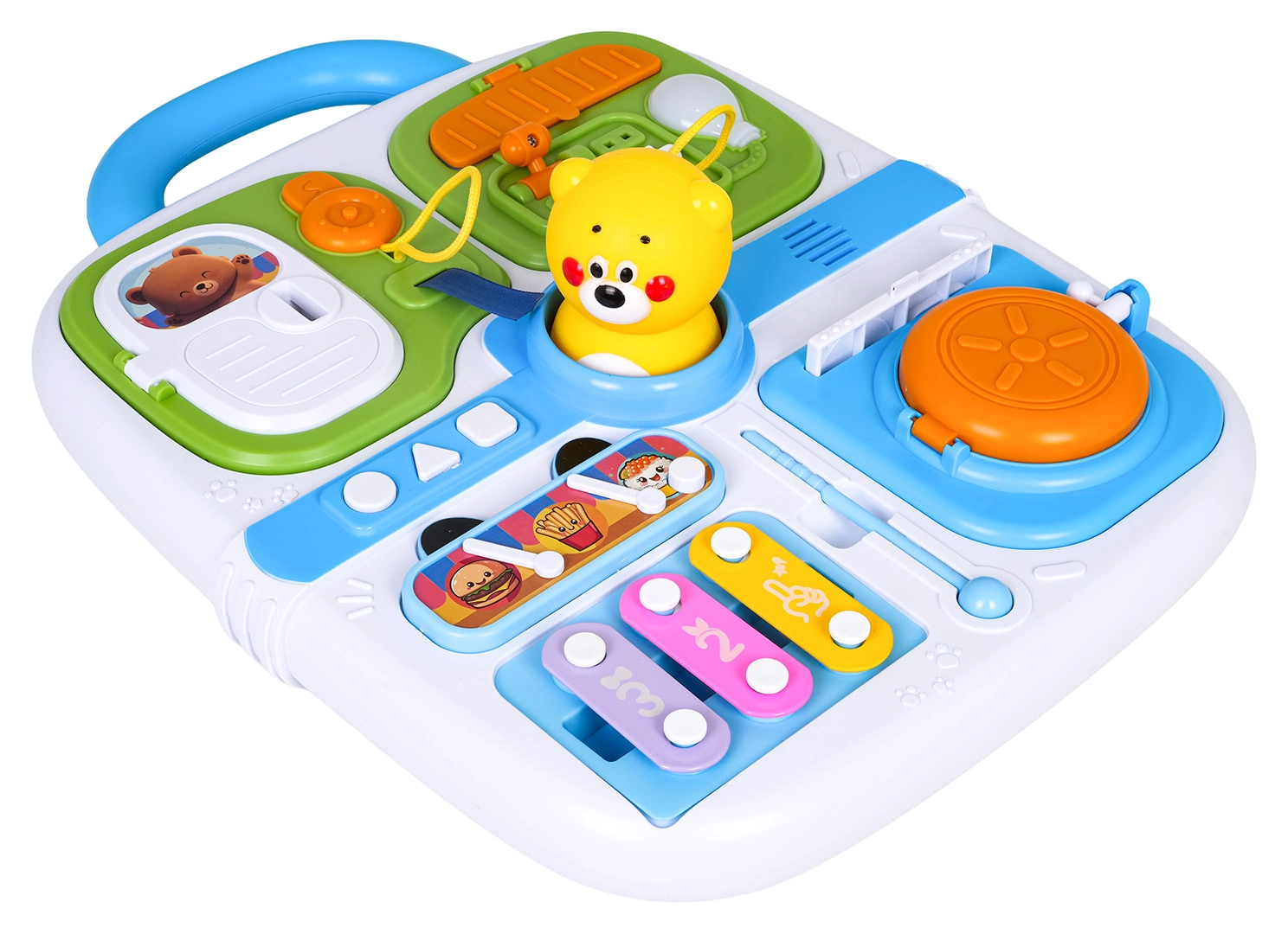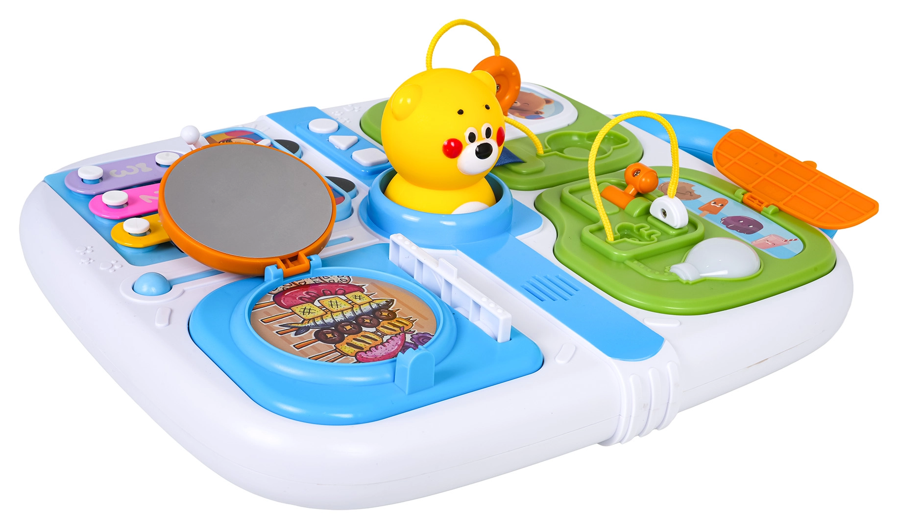 - deschidere, glisare, apăsare, elemente rotative, ușițe cu cheiță, conectare ștecher cu lumină, efecte sonore, ursuleț care piuie, mini cimbal cu baghetă