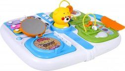 Mini cimbal cu baghetă și ursuleț care piuie în centru captează interesul copiilor și dezvoltă auzul și simțul ritmului. Mânerul integrat facilitează transportul.