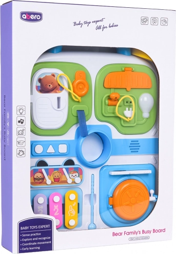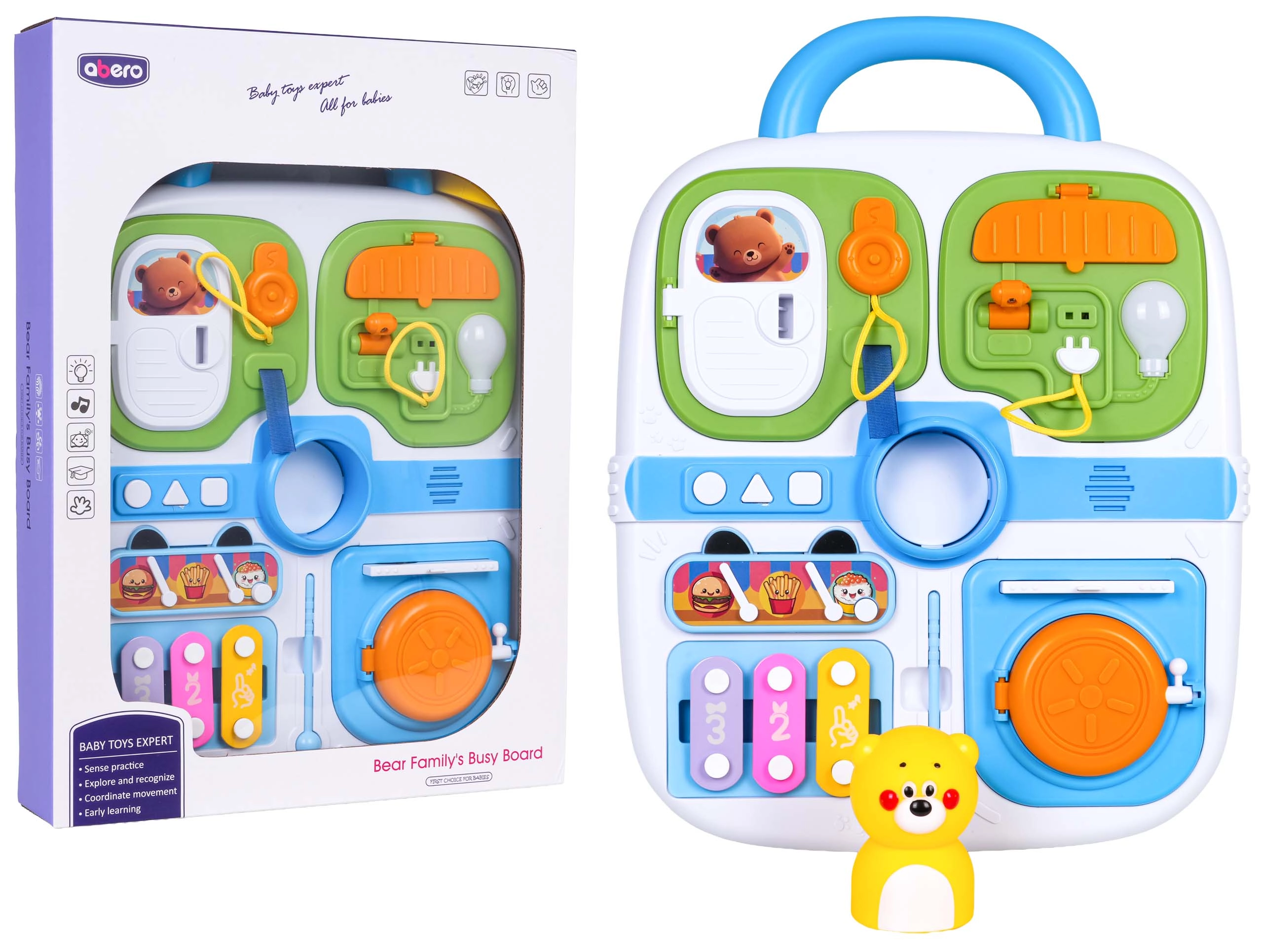 Descoperiți amuzanta geantă de manipulare multifuncțională pentru copii, care dezvoltă motricitatea fină, gândirea logică și percepția senzorială. Elementele interactive colorate invită la deschidere, glisare și apăsare, iar cimbalul cu baghetă, becul care se aprinde după conectarea „șteiței”, efectele sonore și mânerul practic pentru transport ușor completează experiența.