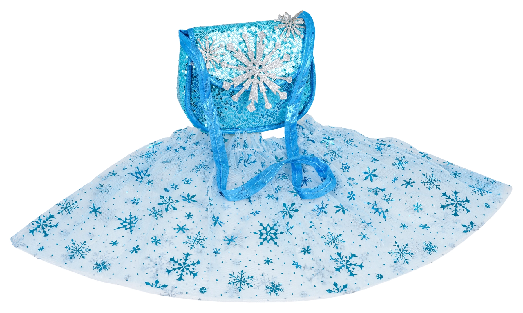 Fustița ușoară din tiul (tulle) cu fulgi de zăpadă și geanta sclipitoare asortată creează ținuta înghețată perfectă pentru orice mică prințesă.