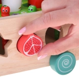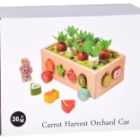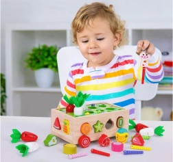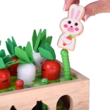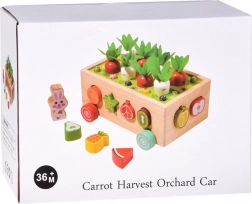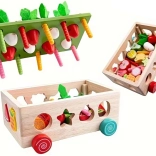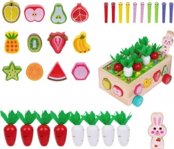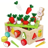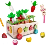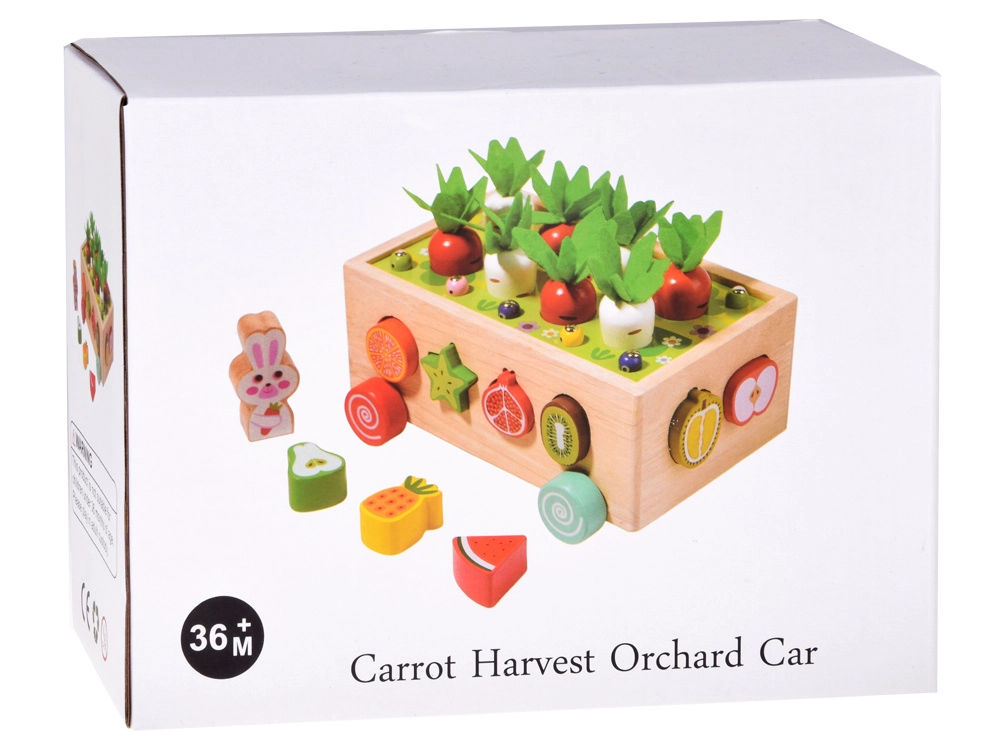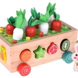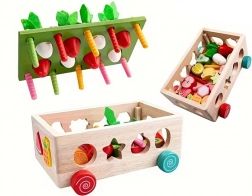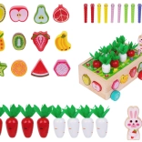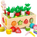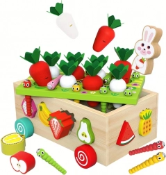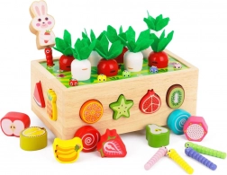 Acest set multifuncțional din lemn, în spirit Montessori, oferă copiilor o gamă variată de activități: plantarea și scoaterea morcovilor cu frunze din fetru, prinderea magnetică a viermișorilor cu ajutorul figurinei de iepuraș și clasica sortare a formelor colorate de fructe în orificiile potrivite. Datorită construcției robuste și marginilor netede, jucăria este sigură și rezistentă pentru joaca zilnică.