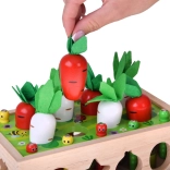 Copiii „plantează” și scot morcovi și ridichi din lemn, cu frunze moi din fetru – un excelent antrenament pentru prindere, forța degetelor și coordonarea mână–ochi.