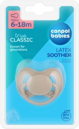Suzeta din cauciuc cu vârf rotund tip cireașă este concepută pentru liniștirea naturală a bebelușului. Cauciucul natural are o nuanță gălbuie mată, este plăcut la atingere și delicat cu gingiile sensibile. Scutul ergonomic cu orificii de ventilație favorizează circulația aerului și ajută la prevenirea iritațiilor pielii din jurul gurii.