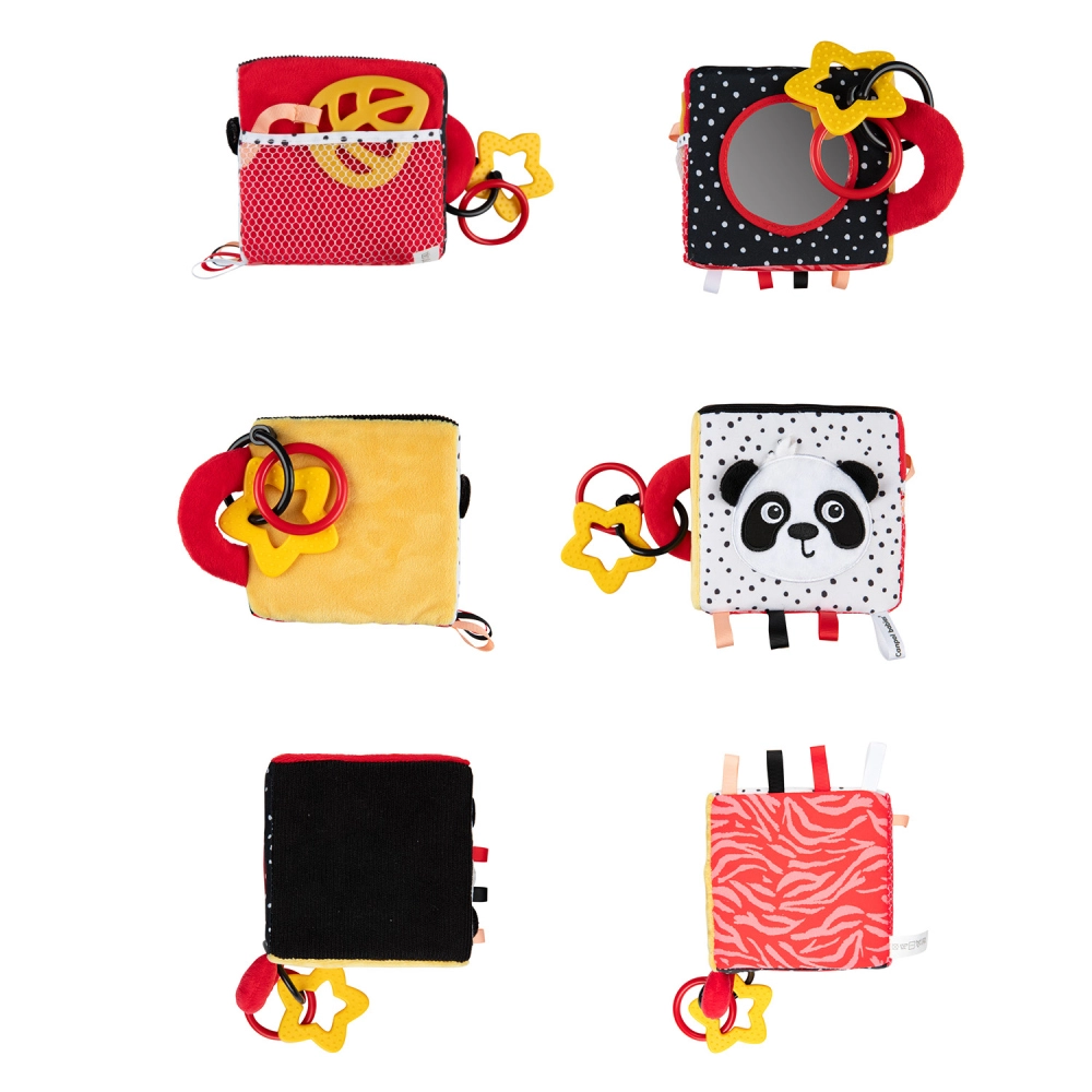 Cuba senzorială moale Canpol babies BabiesBoo, în culori contrastante, susține dezvoltarea văzului, auzului și simțului tactil încă din primele zile. Oferă elemente foșnitoare, o zornăitoare delicată, o oglindă sigură și un inele de dentiție flexibil pentru alinarea durerilor la erupția dinților. Datorită inelului universal o poți atașa ușor la cărucior, pătuț sau scaunul auto.
