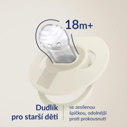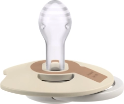 Forma atent gândită a scutului, cu decupaje, minimizează contactul cu pielea sensibilă, îmbunătățește circulația aerului și reduce riscul de iritații. Elemente practice luminoase facilitează găsirea suzetei în întuneric, astfel încât trezirile nocturne sunt mai rapide și mai liniștite. Pachetul conține 2 bucăți de suzetă și o cutie de sterilizare pentru depozitare igienică și dezinfectare ușoară la microunde.