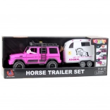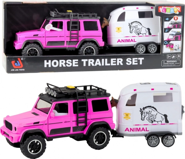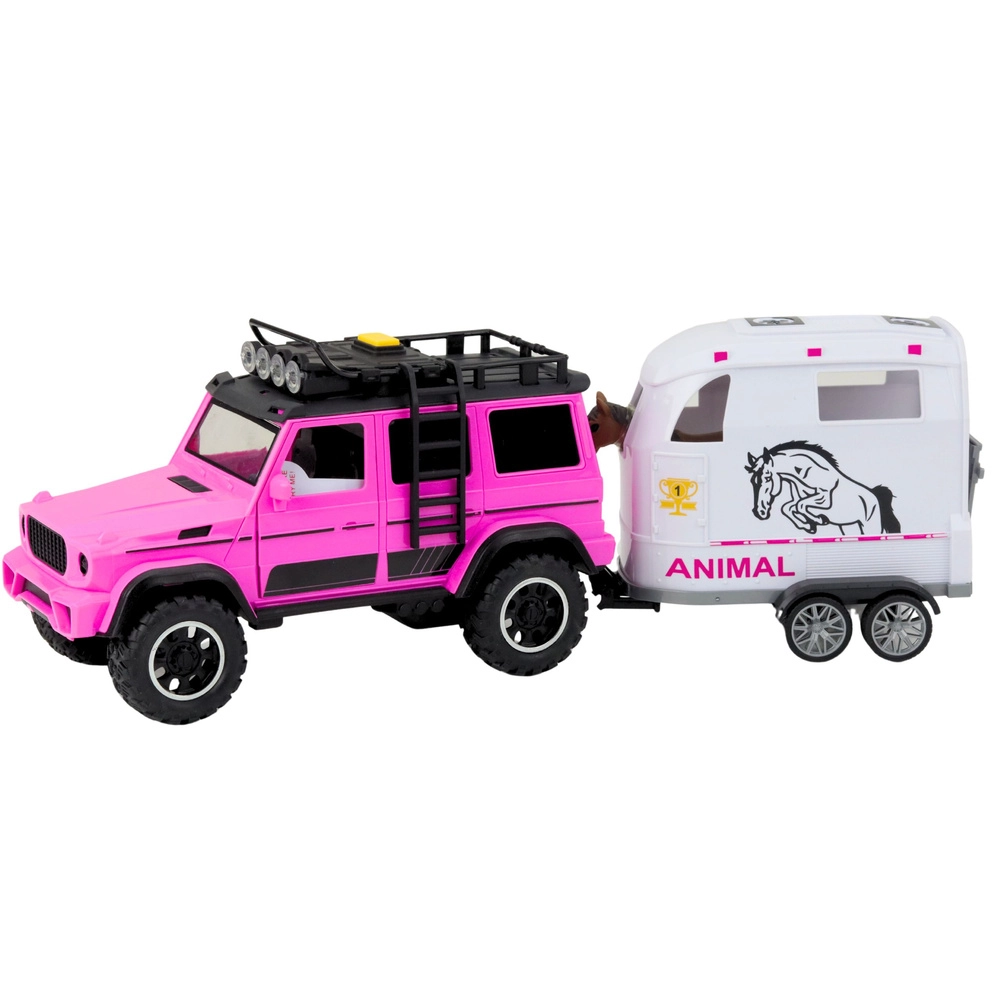 Descoperiți un set de joc realist care combină o mașină de teren robustă și o remorcă pentru cal. Datorită execuției detaliate, plasticului de calitate și schemei de culori atractive roz-alb, jucăria pare autentică și susține creativitatea și motricitatea fină.