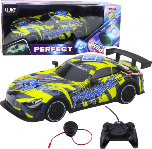 Mașină RC de curse stilată în combinație galben‑albastru‑negru, cu gamă completă de funcții de rulare, control stabil pe frecvența de 27 MHz și caroserie iluminată spectaculos controlată printr-un buton separat. Construcția robustă și posibilitatea de reglare a convergenței roților garantează distracție excelentă și un control mai bun al condusului.