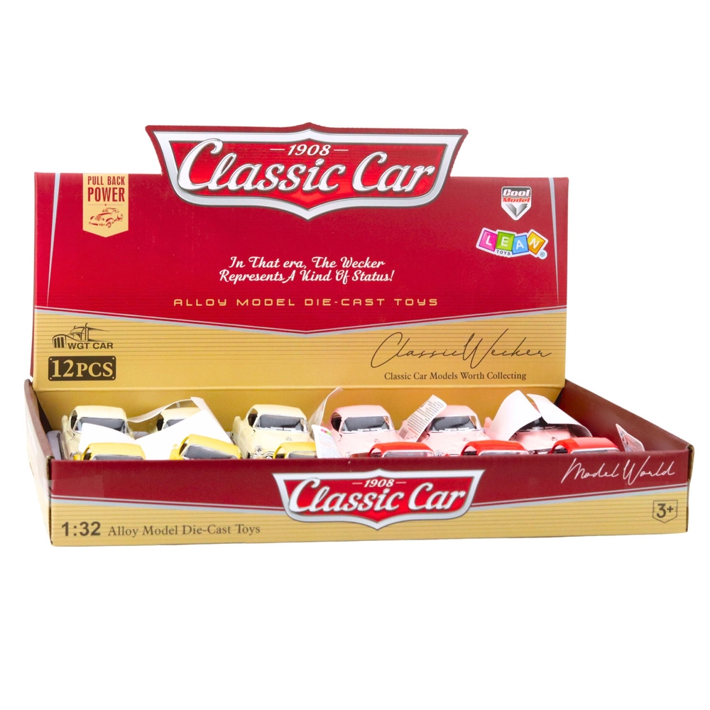 Mașinuță retro stilată din metal, la scară 1:32, care va încânta atât copiii, cât și colecționarii. Are mecanism pull-back cu arc, uși care se deschid și elemente cromate detaliate. Construcția robustă, designul realist din anii ’50 și variantele de culoare diverse fac din acest model un cadou grozav și o piesă de vitrină excelentă.