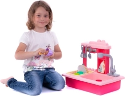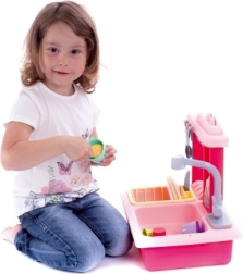 Bucurați-vă de spălatul vesel al vaselor cu această chiuvetă pentru copii de culoare roz, care include un robinet funcțional, un rezervor de apă și un suport de scurgere detașabil.