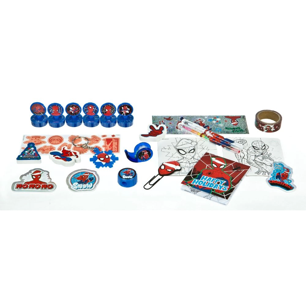 În interior îi așteaptă pe copii obiecte precum mini ștampile, puzzle, breloc, bandă cu dispenser, autocolante holografice, mini creion, mini creion colorat, autocolante cu sclipici în mișcare, agrafe de birou, carnețel, radiere modelate și bandă washi. Fiecare fereastră este o mică aventură și îi va încânta pe toți iubitorii SPIDER-MAN.