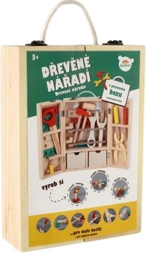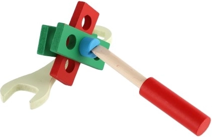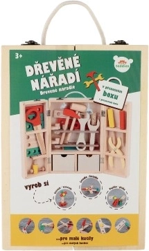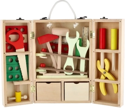 Descoperiți geanta din lemn cu unelte de calitate, care le permite copiilor să imite în siguranță lumea adulților. Setul include șurubelnițe, ciocănel, chei, piulițe, șuruburi, echer, riglă, fierăstrău și alte accesorii. Totul este ordonat într-o geantă robustă, cu mâner, pentru transport facil.