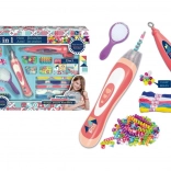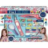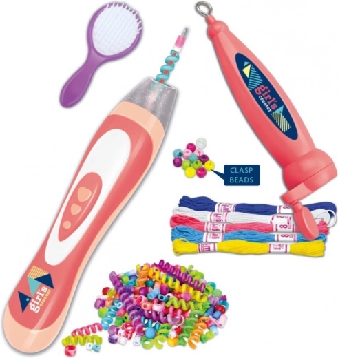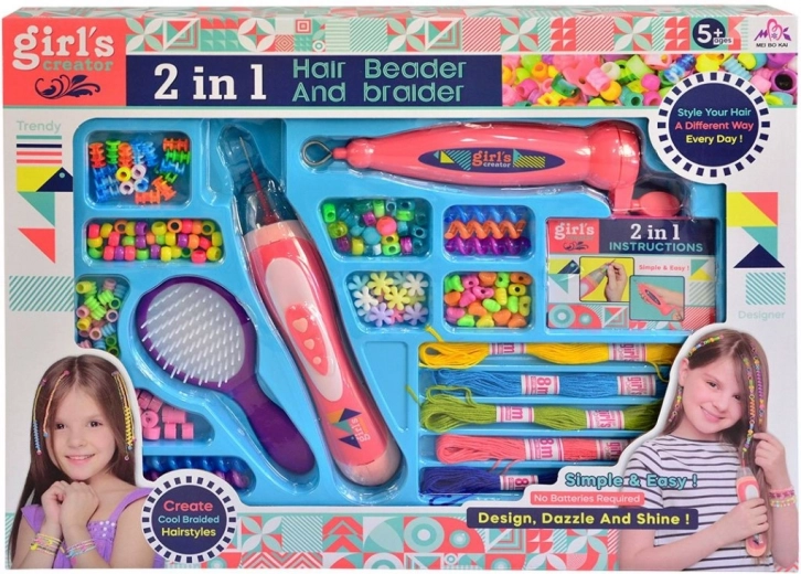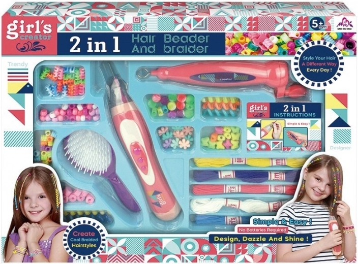 Set creativ pentru micile stiliste, care permite realizarea de coafuri colorate cu ajutorul mărgelelor, firelor de bumbac și împletitorului. Pur și simplu înșirați mărgelele, combinați culorile și în câteva clipe creați ornamente originale pentru păr. Setul include împletitor, înșirător, pieptene și o selecție variată de mărgele și este potrivit pentru copii de la 3 ani.