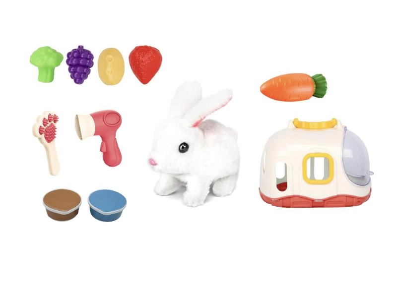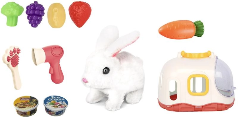 În pachet găsești tot ce au nevoie copiii pentru îngrijire și joacă: pieptene și uscător pentru aranjarea blănii și bunătăți din plastic (fructe și legume) pentru jocul de hrănire. Jucăria susține imaginația, motricitatea fină și un spirit responsabil față de îngrijirea unui animăluț.