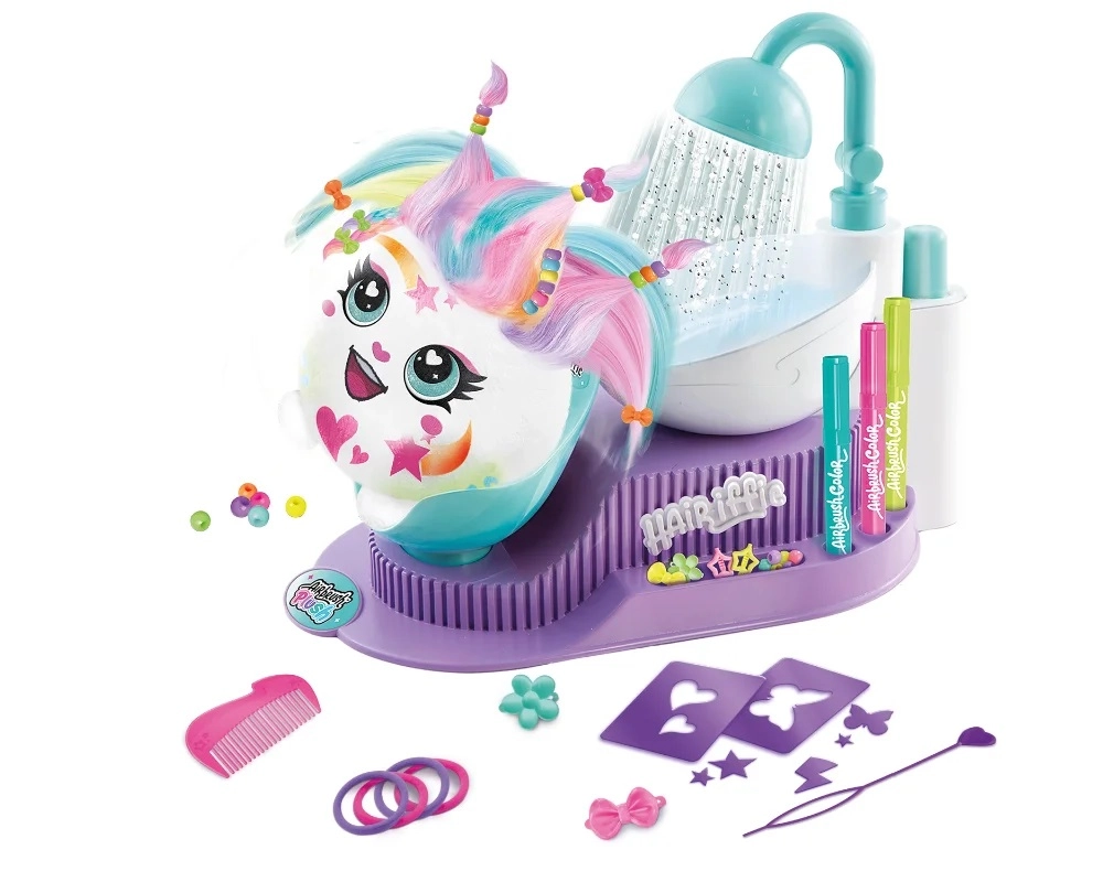 Jetul real de apă din mini-salon permite îndepărtarea culorilor de pe pluș și pregătirea pentru o nouă stilizare. Copiii se bucură de senzația autentică a îngrijirii într-un salon de coafură.