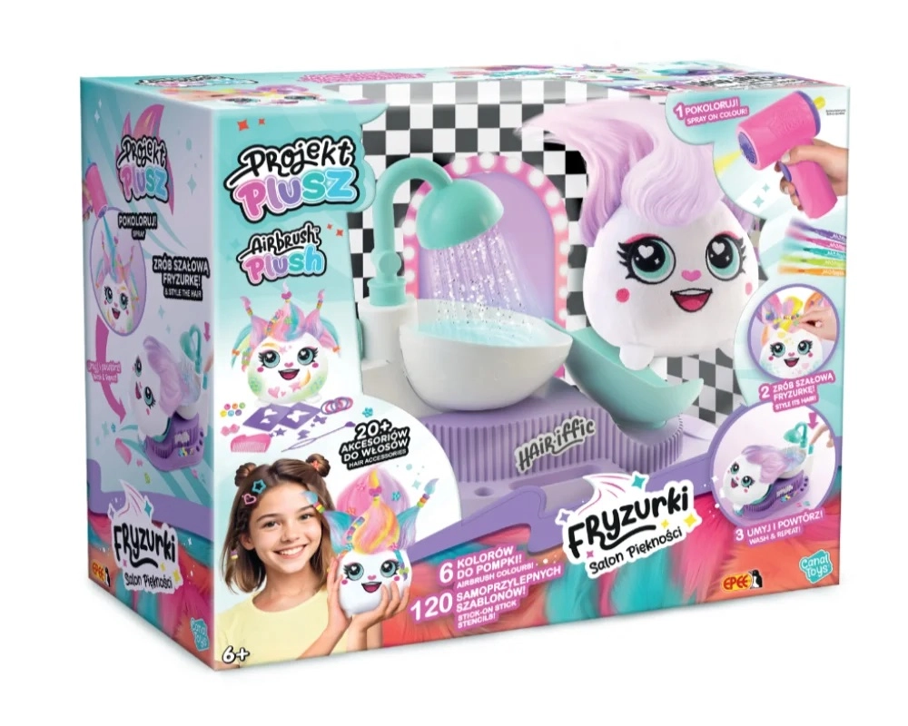 Setul creativ Epee Projekt Plusz Fryzurki – Salon de înfrumusețare le oferă copiilor tot ce au nevoie pentru decorarea și aranjarea unui animăluț de pluș. Cu ajutorul airbrushului electronic în formă de uscător și al șabloanelor, aplică ușor modele colorate, care pot fi complet schimbate după spălare, pentru a crea din nou și din nou. Stația de spălare cu jet de apă adaugă un plus de realism jocului și îi învață pe copii să îngrijească propria creație.