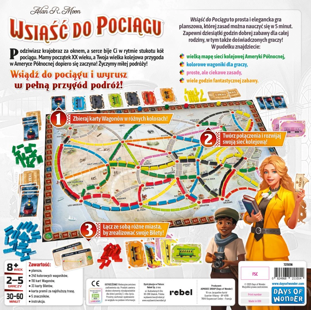Pornește într-o aventură prin America de Nord cu jocul de societate pentru familie Urcă în Tren. Colectează cărți colorate de vagoane, construiește linii feroviare între orașe și îndeplinește misiuni secrete pentru cât mai multe puncte. Această ediție oferă componente actualizate și un design îmbunătățit, reguli simple și o rejucabilitate ridicată pentru copii și adulți.