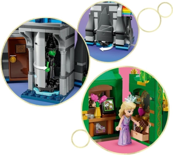 Descoperiți locații iconice WICKED într-un singur pachet: elegantul Oraș de Smarald cu cameră stilată și harta ascunsă a ținutului Oz, și castelul întunecat Kiamo Ko cu mecanism rotativ și ascunzătoare secretă pentru Elphaba. Podul curcubeu din cărămizi le permite copiilor să-și spună propriile povești și să expună setul ca un accesoriu de design pentru cameră.