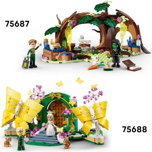Setul include două mini-păpuși (Glinda și Elphaba), o figurină de maimuță zburătoare și o serie de accesorii pentru joc de rol – de la grimoar și felinare până la un pick-up (gramofon). 860 de piese garantează ore întregi de construit și joacă, iar aplicația LEGO Builder îi ghidează pe copii printr-o construcție intuitivă cu previzualizări 3D, rotații ale modelelor și urmărirea progresului.