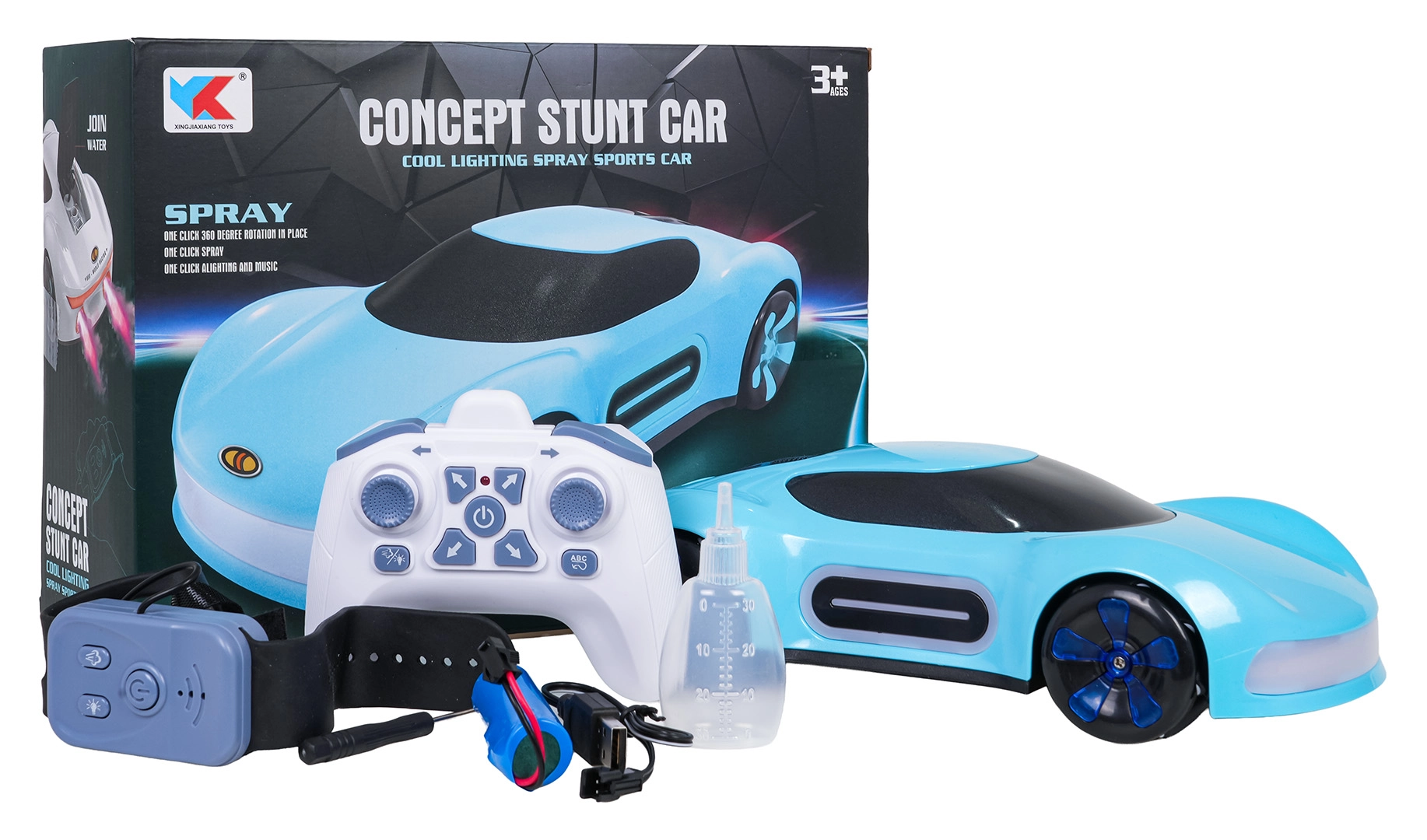 Mașina stăpânește deplasarea înainte/înapoi, rotirea dreapta/stânga, deplasarea laterală, driftul și rotirile la 360°. Controlul este intuitiv – alegeți între telecomanda manuală sau gesturile pe ceas. Pachetul include un acumulator de 3,7 V reîncărcabil și cablu USB pentru încărcare ușoară.