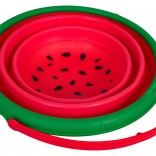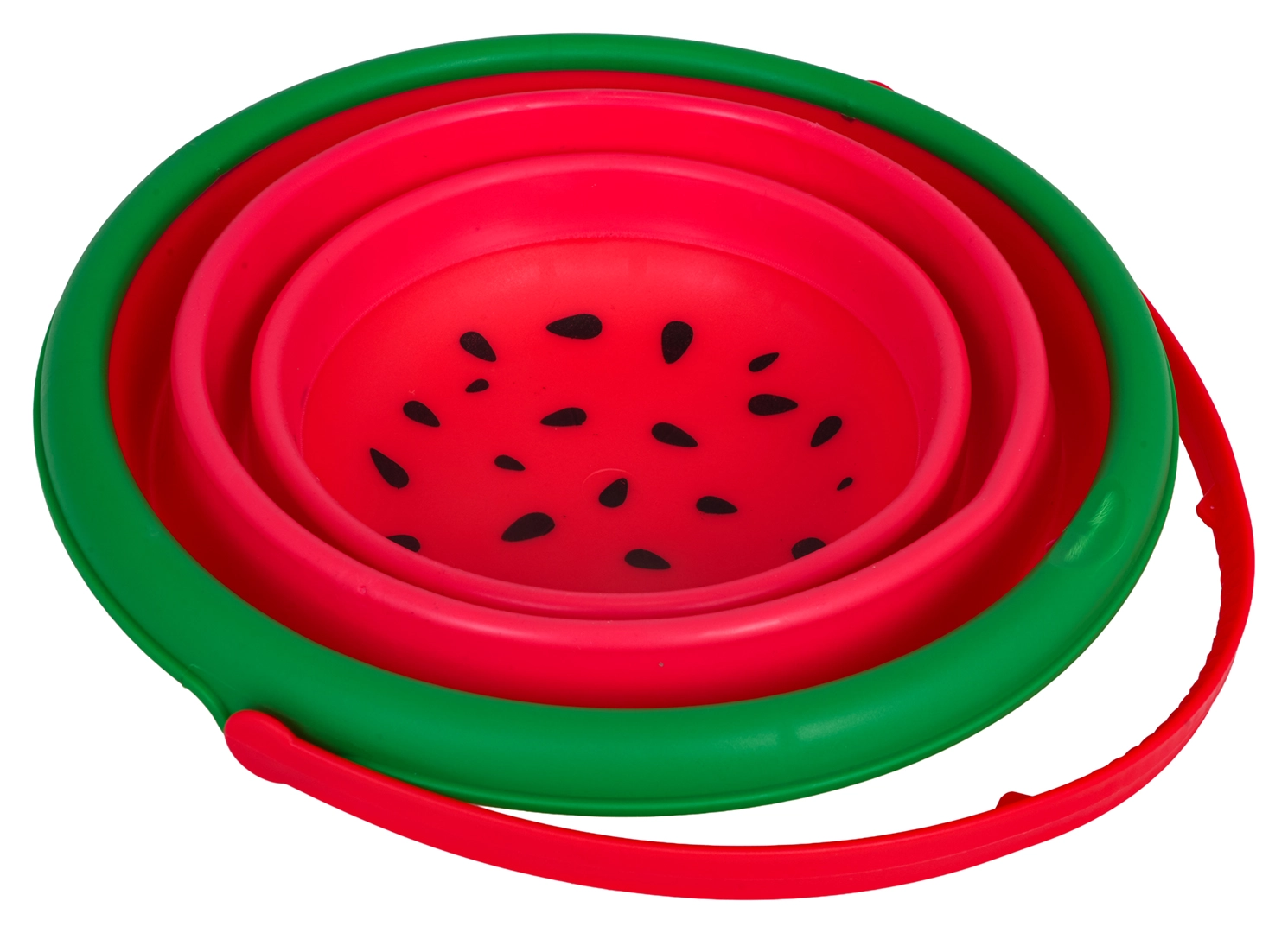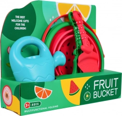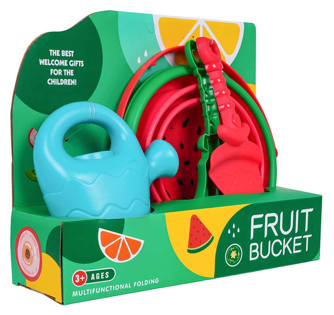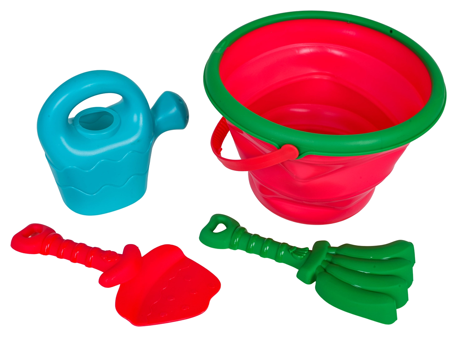 Descoperiți un set practic pentru nisip, cu care joaca la apă sau în nisip va fi și mai distractivă. Găleata pliabilă din plastic rezistent și silicon se pliază rapid într-o formă compactă, astfel încât încape în orice geantă. Lopățica, grebla și stropitoarea sunt concepute pentru mâinile mici ale copiilor – ușoare, sigure și cu margini netede.
