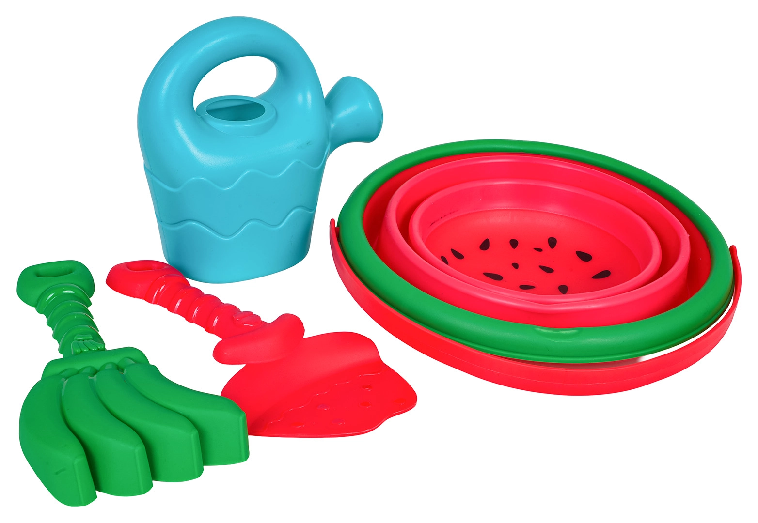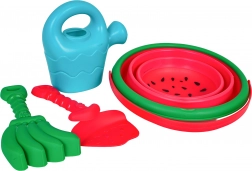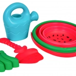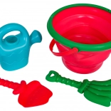Set vesel pentru nisip, potrivit copiilor de la 3 ani, conține găleată pliabilă, lopățică, greblă și stropitoare. Construcția ușoară și sigură din plastic și silicon este ideală pentru locul de joacă cu nisip și plajă. Găleata pliabilă economisește spațiu în rucsac și se transportă ușor.