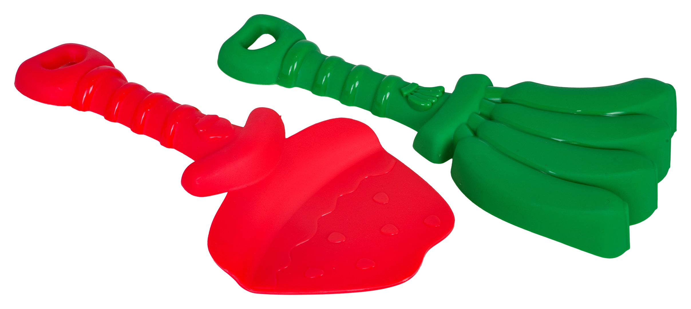 Lopățica, grebla și stropitoarea le permit copiilor să sape, să grebleze, să modeleze și să toarne apă – totul într-un singur set.