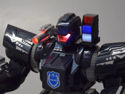 Picioare masive și tălpi late pentru mers stabil, detalii POLICE, ecusoane și bară luminoasă pe umăr. Brațele mobile permit setarea de poziții dinamice.