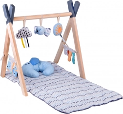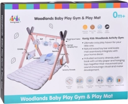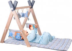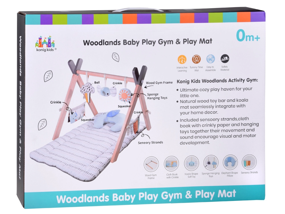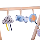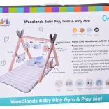 Baby gym-ul din lemn, stilat, oferă bebelușului un spațiu confortabil atât pe burtică, cât și pe spate, iar jucăriile moi suspendate îl îndeamnă să se întindă, să prindă și să exploreze texturi variate. Elementele contrastante, materialele foșnitoare și piese cu sunete stimulează natural vederea, auzul și simțul tactil.