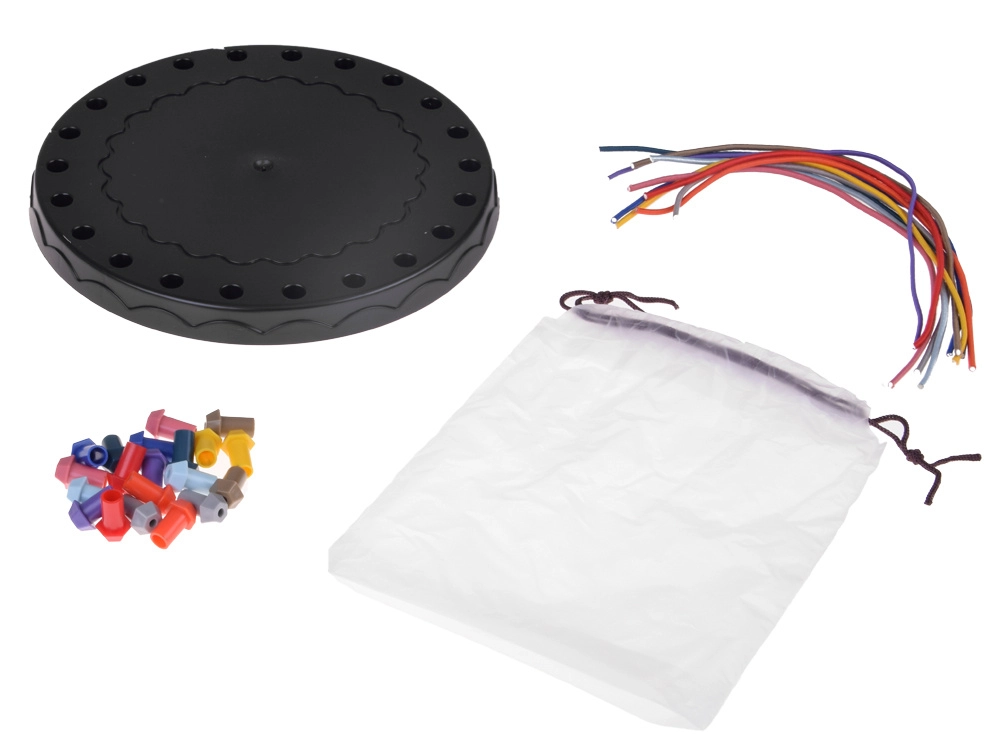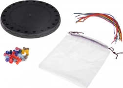 Tablă circulară, set de pioni și șnururi, plus un săculeț practic pentru transport – ideal pentru călătorii și pentru școală.