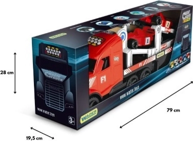 Transportorul mare Magic Truck Action Formula 1 îi va încânta pe toți micii pasionați de motoare și curse. Capul tractor, realizat realist, cu semiremorcă lungă, transportă două monoposturi F1 incluse, pe care le poți încărca ușor cu ajutorul rampelor. Semiremorca este detașabilă și poate fi cuplată la cabină în două moduri, ceea ce extinde posibilitățile de joc.