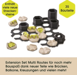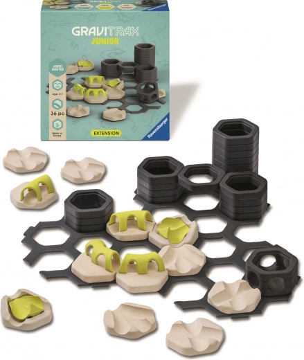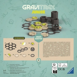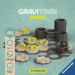 Extensia oferă mai multe modalități de a ghida bilele în direcții diferite și de a crea trasee întortocheate pline de surprize. Este ideală pentru extinderea seturilor existente GraviTrax Junior și susține joaca creativă și independentă a copiilor de la 3 ani.