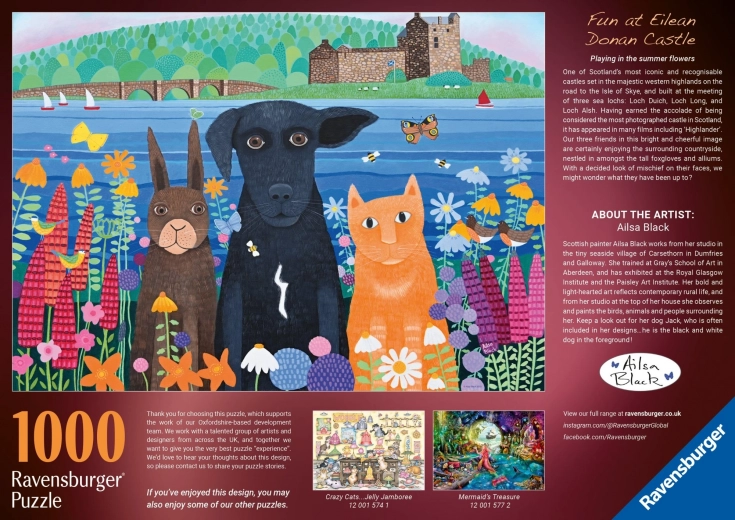 Bucurați-vă de ore de relaxare cu puzzle-ul de calitate RAVENSBURGER. Setul de 1000 de piese cu motivul prietenilor din lumea animalelor oferă execuție precisă, tăiere perfectă și suprafață mată pentru o asamblare plăcută. Ideal pentru iubitorii de puzzle-uri sau ca cadou.