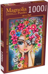Puzzle elegant cu motivul unei fete înconjurate de flori, pentru momente de liniște și relaxare. Conține 1000 de piese și, după asamblare, are dimensiunea de 48 × 68 cm – ideal pentru înrămare și expunere.