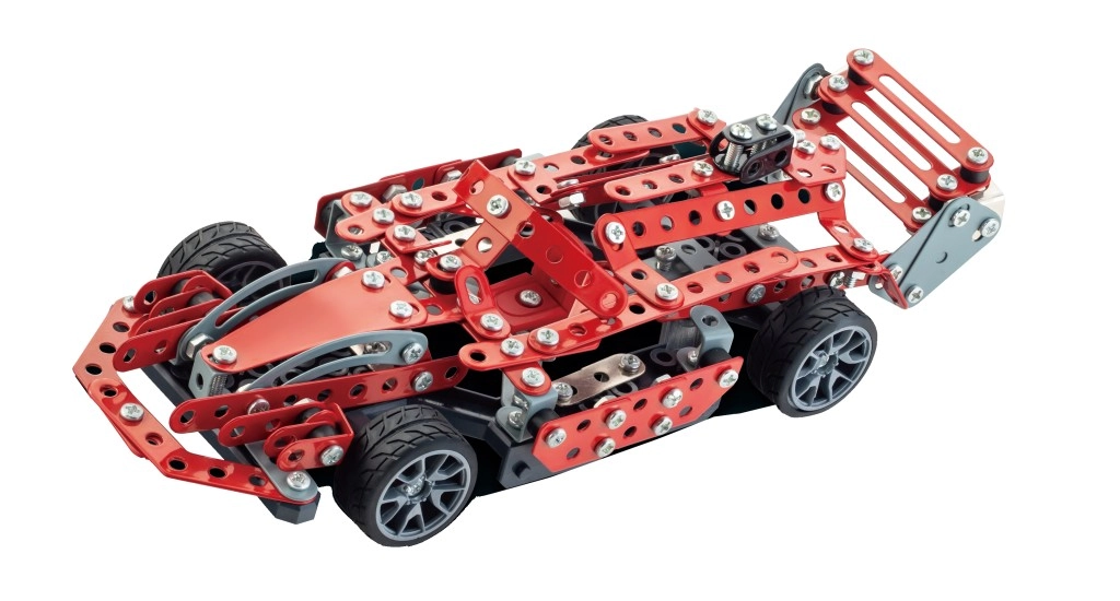 Construiește-ți propria mașină de curse din metal! Acest set de construcție metalic tip formulă cu 287 de piese combină componente metalice rezistente și accesorii din plastic, care se asamblează cu ajutorul șuruburilor și piulițelor. Oferă construcție distractivă și totodată provocatoare, dezvoltă răbdarea, îndemânarea și gândirea tehnică – o alegere perfectă pentru micii și marii constructori.