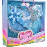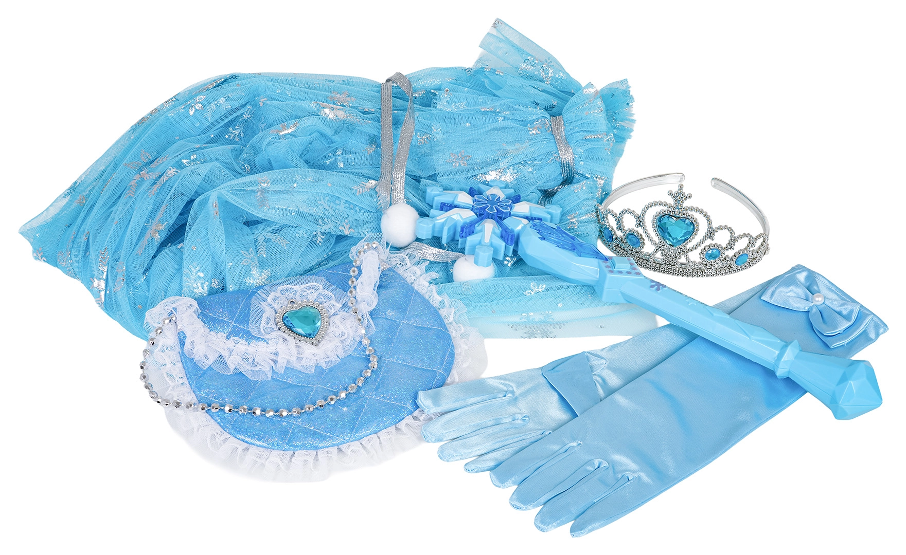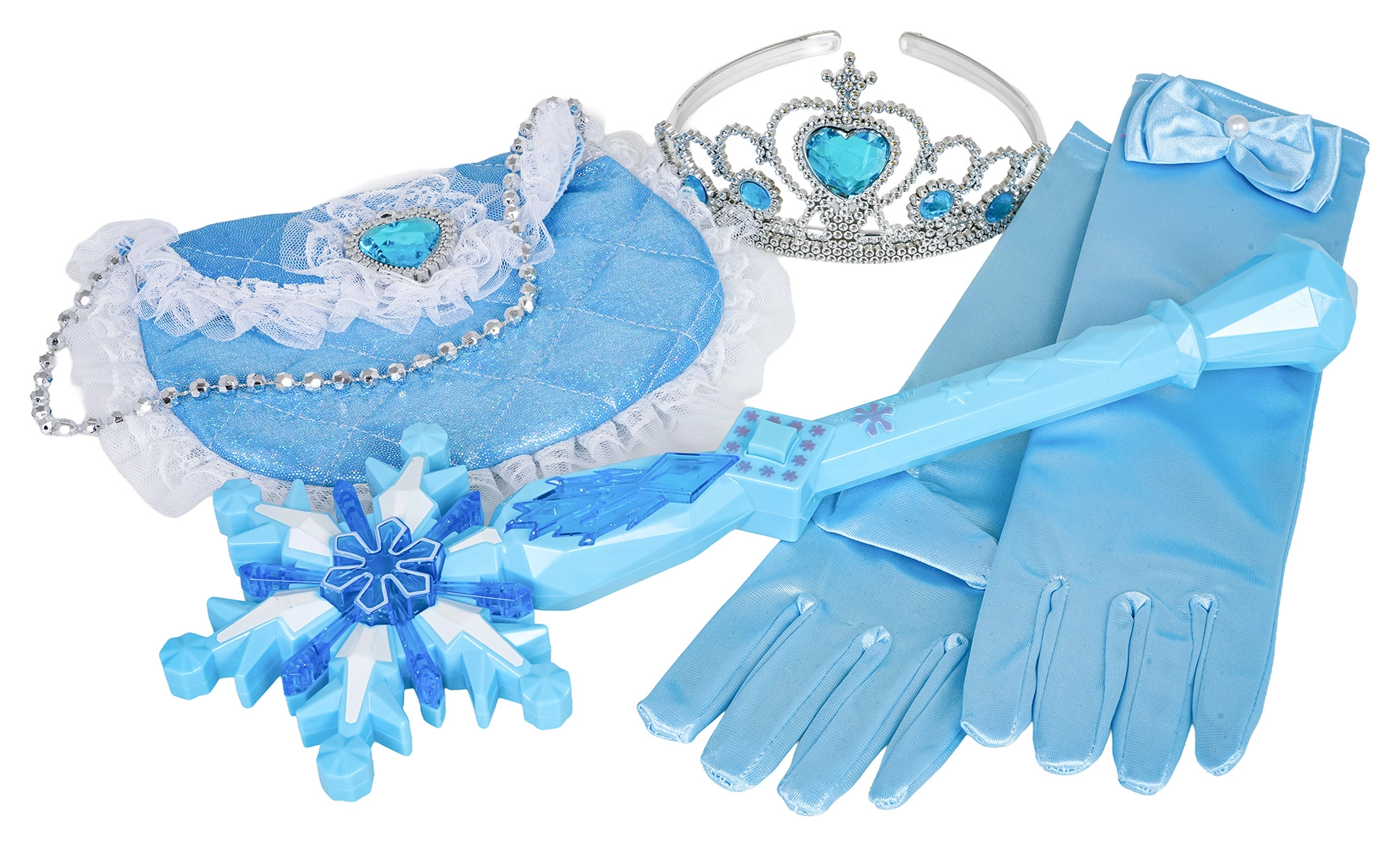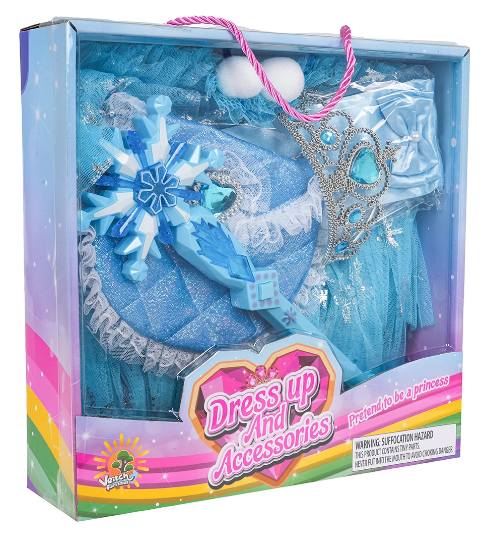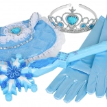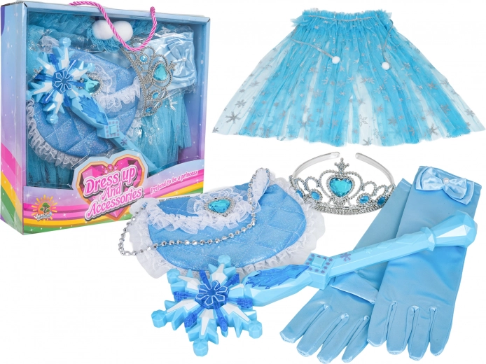 Pachetul include mănuși lungi, tiară cu pietricele, baghetă magică în formă de fulg de nea și o poșetă mică cu dantelă – toate asortate coloristic pentru un aspect impecabil. O alegere grozavă pentru petreceri pentru copii, spectacole școlare, carnaval și jocuri imaginative acasă.