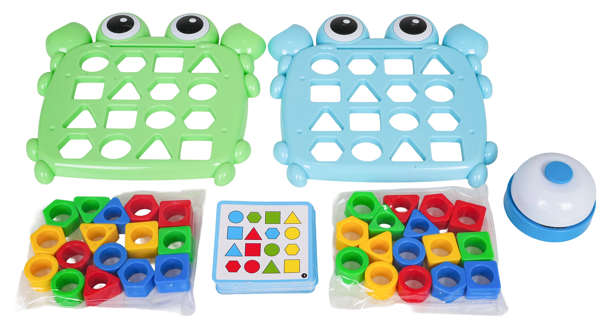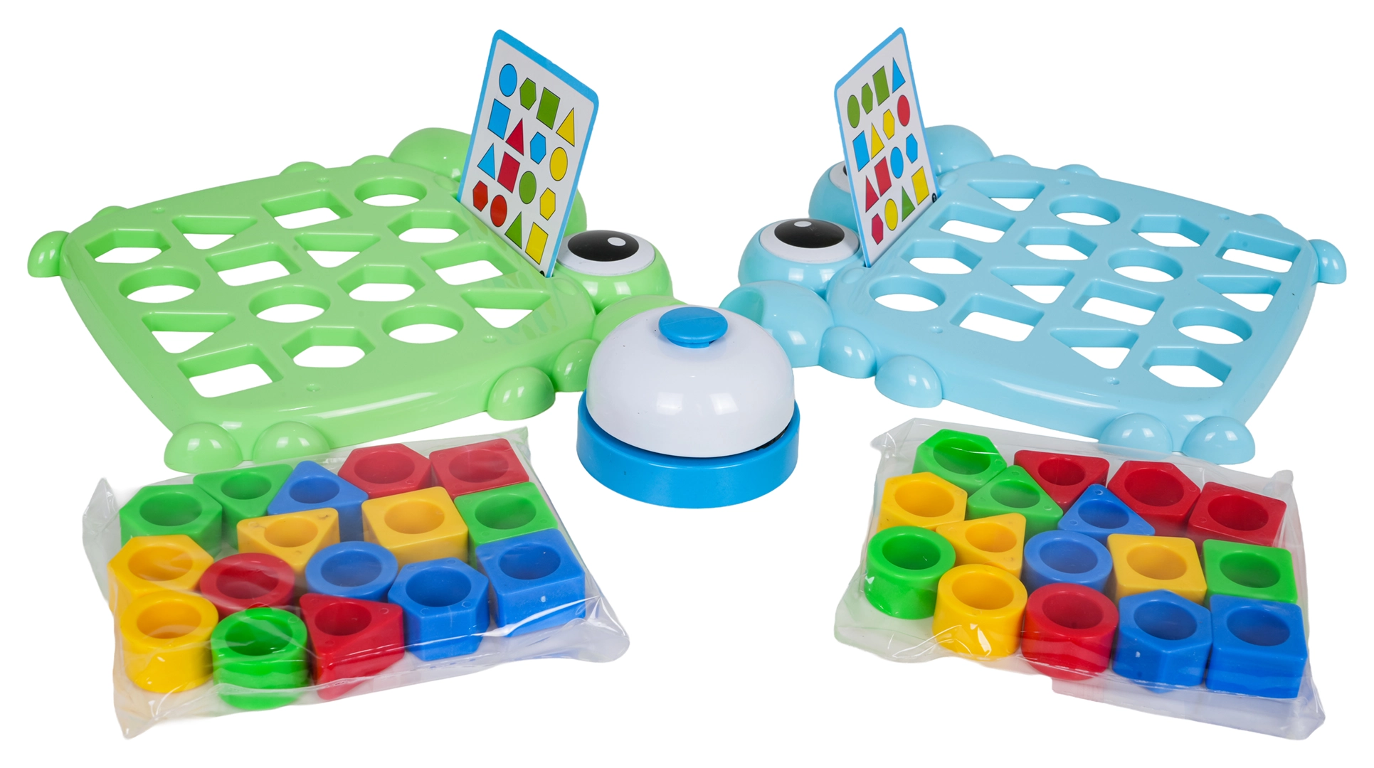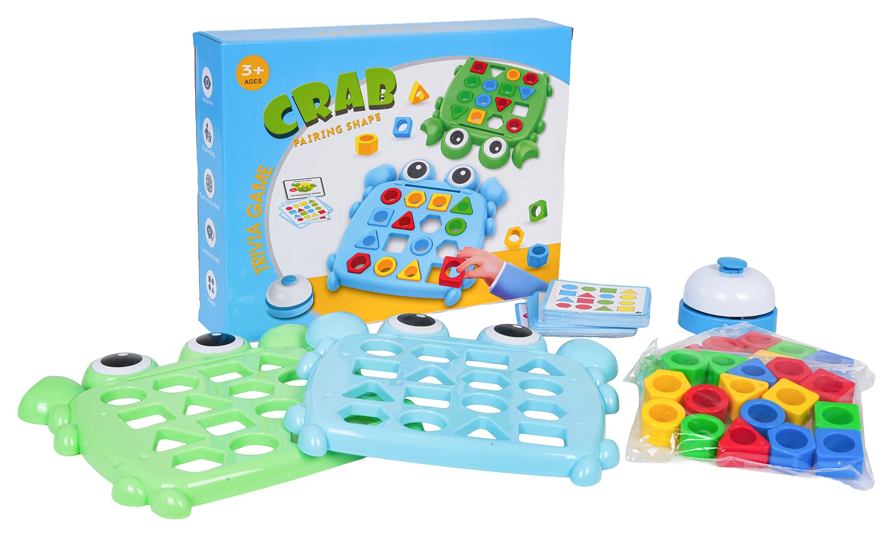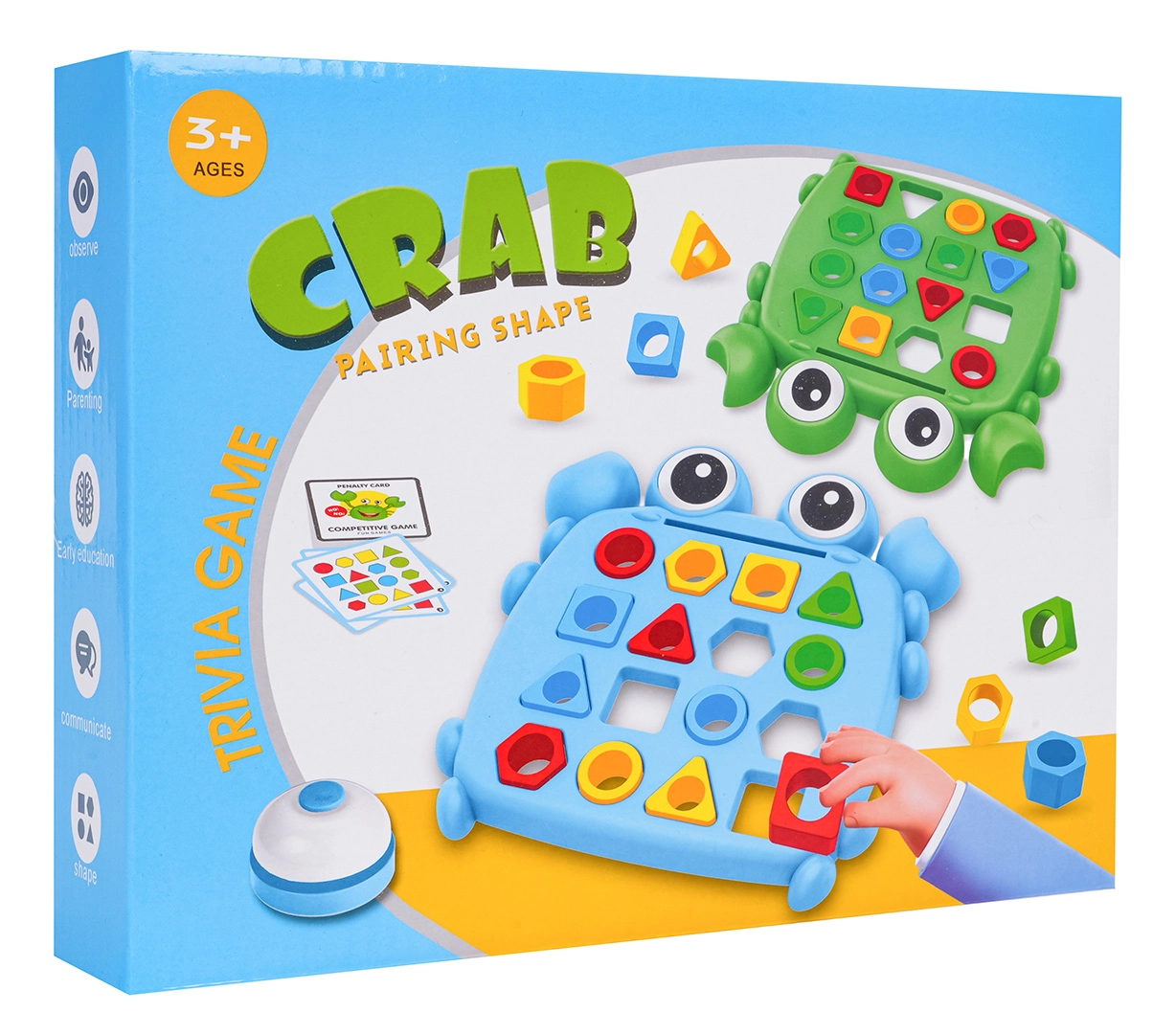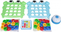 Acest joc captivant pentru copii, cu tematică de crab, îmbină învățarea cu competiția. Copiii aleg o carte-model, introduc formele colorate în decupajele de pe planșă și își antrenează logica, spiritul de observație și coordonarea mână–ochi. În jocul în doi, viteza face diferența – cine finalizează primul modelul și apasă clopoțelul câștigă cartea.