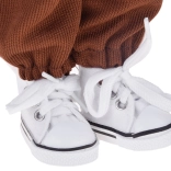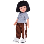 Ținuta sport îmbină confortul cu aspectul modern: tricou gri cu imprimeu, pantaloni de trening maro cu dungi albe și teneși albi cu șireturi. Datorită capului, mâinilor și picioarelor mobile, poți crea ușor scene și povești noi.