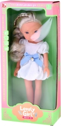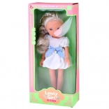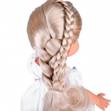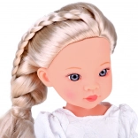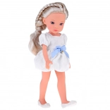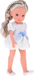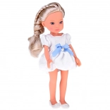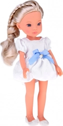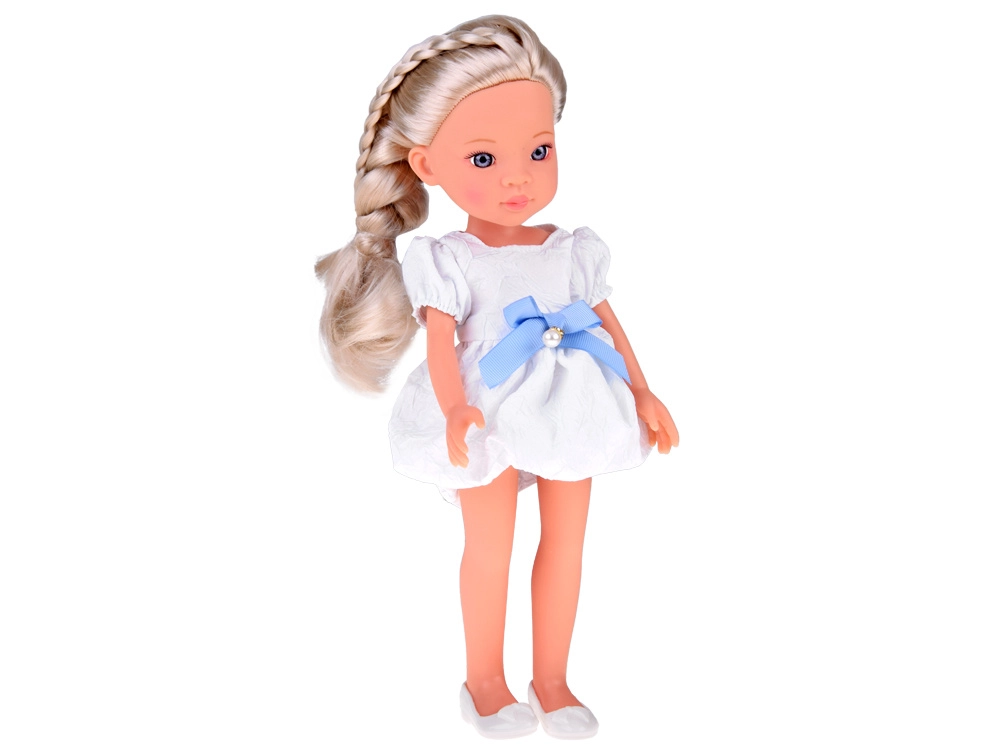 Sunt incluse o rochie albă fermecătoare cu fundă albastră și decor perlat discret și balerini albi. Chipul modelat în detaliu, cu ochi mari, strălucitori, oferă un aspect realist, făcând din ea o frumoasă companionă pentru camera copiilor sau colecție.