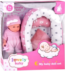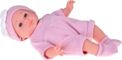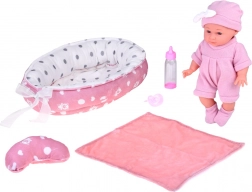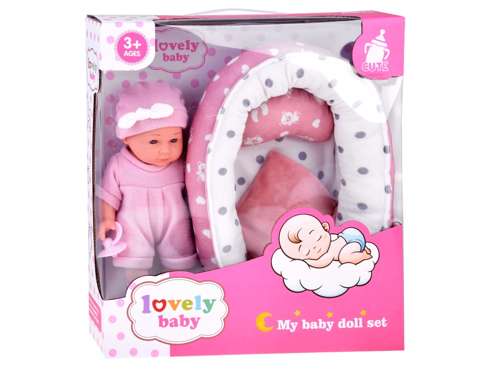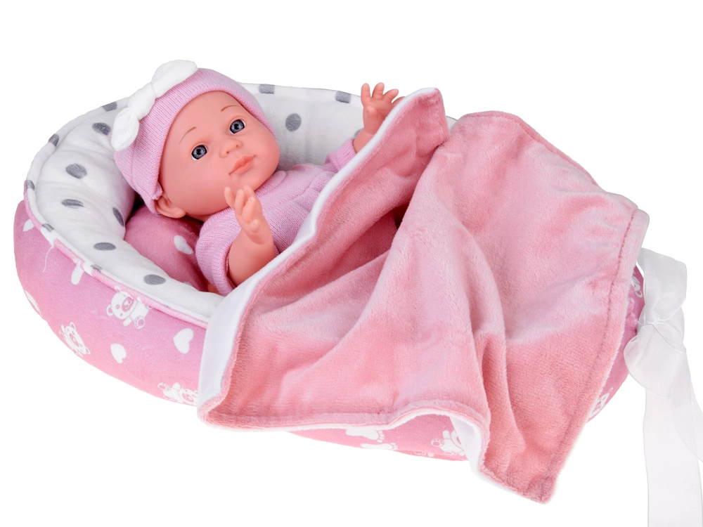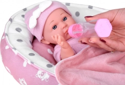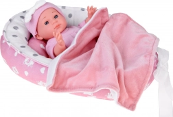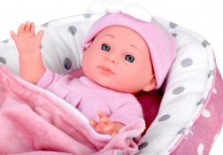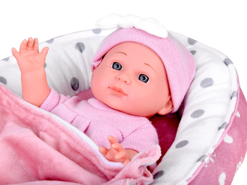 Bebeluș adorabil în hăinuță roz cu cuib textil moale, pernuță și păturică, aducând copiilor un joc realist de îngrijire. Sunt incluse și biberon și suzetă, păpușa are membre mobile și hăinuțe ușor de scos în culori pastelate delicate.