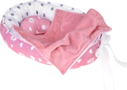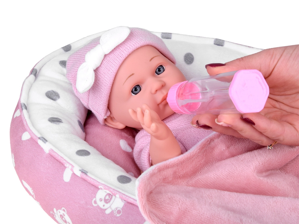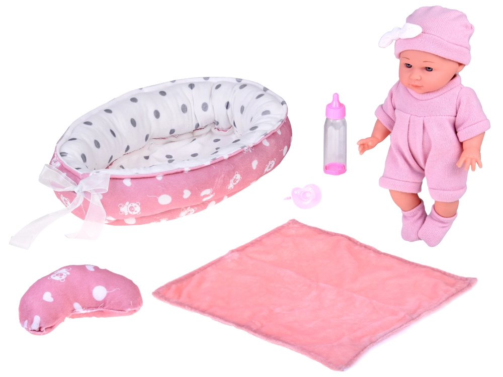 - Păpușă în hăinuță și căciuliță roz, cuib textil cu pernuță și păturică, biberon, suzetă