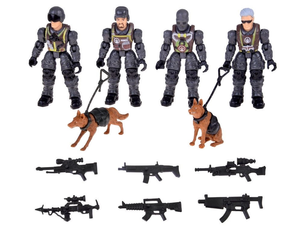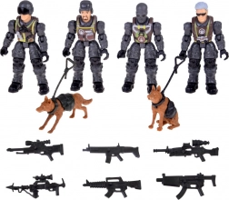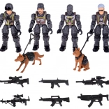Set mare de figurine militare pentru joc creativ, care include 4 soldați articulați, 2 câini polițiști și 6 piese de armament. Construcția durabilă, cu accent pe detalii și articulații mobile, permite crearea diferitelor scene și misiuni, dezvoltând imaginația și motricitatea fină a copiilor.