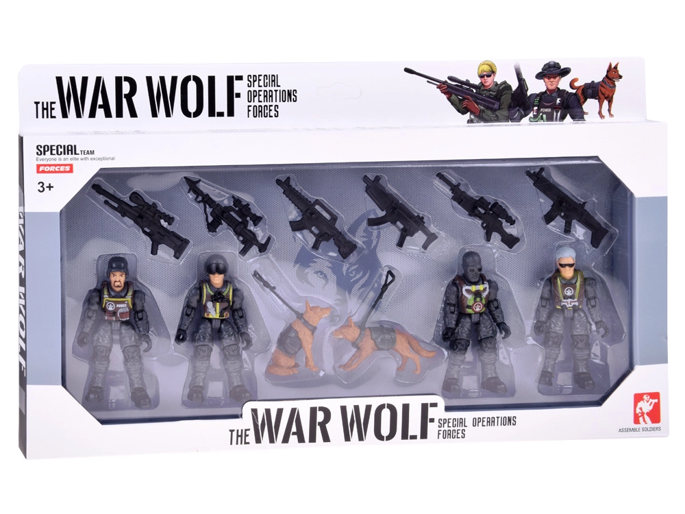 - Conținutul pachetului: 4 figurine de soldați, 2 figurine de câini, 6 modele de arme