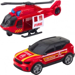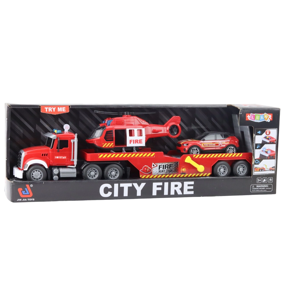 Acest set detaliat le oferă copiilor scenarii pline de acțiune, de la tractarea vehiculelor până la intervenții aeriene. Platforma de încărcare de pe remorcă permite încărcarea și descărcarea facilă a mașinii de pompieri, în timp ce elicopterul cu roți se poate deplasa pe podea ca un vehicul terestru. Atmosfera este completată de lumini și sunete activate prin butoane, care adaugă autenticitate jocului.