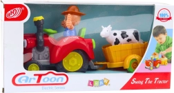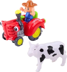 Acest tractor colorat și sigur oferă copiilor un joc distractiv și educativ. După pornire, tractorul pornește înainte și înapoi, se aprind luminițele în coș și în „ochișori”, iar melodii vesele și un salut se aud. Copiii pot transporta văcuța pe remorcă și își pot crea propriile povești de fermă.