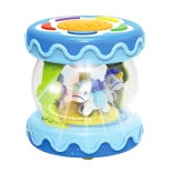 Datorită celor 6 butoane funcționale, jucăria oferă o gamă largă de sunete – de la bătăi de tobe, melodii de percuție, până la sunete de animale și rime amuzante. Cilindrul/rollerul inclus ajută la învățarea târârii și motivează copilul la mișcare. După 60 de secunde se activează modul standby, care economisește bateria.