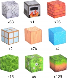 - 14× cub (piatră), 19× cub (iarbă), 15× cub (frunziș), 15× cub (cărămidă), 15× cub (apă), 14× cub (lemn), 14× cub (pământ), 1× cub (cuptor), 1× cub (model special)
